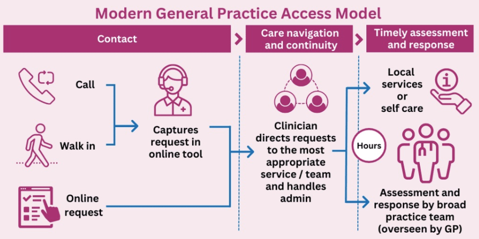 Rapid Health allows our practice to follow the NHS recommended general practice model (as shown above). More information about this model can be found here (NHS England).
